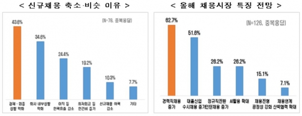 기업들이 대졸 신규채용을 늘리지 못하는 가장 큰 이유로는 국내외 경제·업종 상황 악화(43.6%)가 꼽혔다. 이어 △회사 내부 상황 악화(34.6%) △신입사원 조기퇴사·이직 등 인력유출 감소(24.4%) △인건비 부담 증가(19.2%) △신규채용 여력 감소 (10.3%) 등 순이었다.
