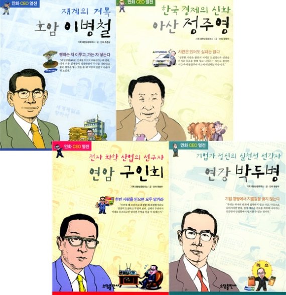 만화 CEO 열전은 재계의 거목 삼성 고 이병철 회장, 한국경제의 신화 현대 고 정주영 회장, 전자 화학 산업의 선구자 고 구인회 회장 등 한국을 대표하는 기업가 10인의 일대기를 엮어 발간한 책이다.