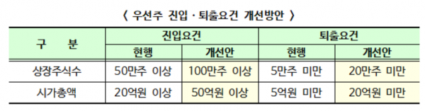 우선 우선주의 상장 주식수 및 시가총액 관련 진입·퇴출 요건을 상향 조정키로 했다. 상장주식수 진입 요건은 50만주에서 100만주 이상으로, 시가총액은 20억원에서 50억원 이상으로 조정된다.
