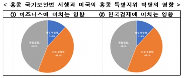 조사 결과를 보면 홍콩 진출 한국기업의 55.9%는 홍콩 국가보안법과 미국의 홍콩 특별지위 박탈이 사업에 부정적인 영향을 미칠 것으로 우려했다. 응답 기업의 70.6%는 홍콩보안법 사태가 한국 경제 전반에도 부정적 영향을 미칠 것으로 전망했다.