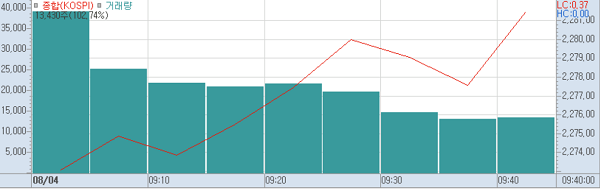4일 오전 9시40분 현재 코스피 지수는 전일보다 30.45p(1.35%) 오른 2281.49를 나타내고 있다. 지수는 전장보다 21.29p(0.95%) 상승한 2272.33에 출발한 이후 상승흐름을 보이고 있다.