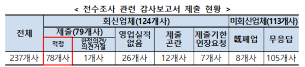 감사보고서 미제출업체의 경우 26곳은 영업실적이 없다고 답했다. 12곳은 비용문제 등으로 제출이 곤란하다고 밝혔으며, 7곳은 제출기한 연장을 요청했다. 아예 회신하지 않은 113개사 중 8곳은 폐업을 신고했다.