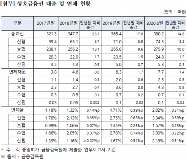 서민금융기관인 상호금융권의 대출 연체율이 높아지고 있는 것은 대출 상환에 어려움을 겪는 서민들이 늘어났기 때문으로 풀이된다. 특히 신종 코로나바이러스 감염증(코로나19)가 장기화될 경우 자본 규모가 영세한 조합의 부실화가 이어질 수 있는 만큼 연체율 추이에 대한 모니터링 강화가 시급하다는 지적이다.