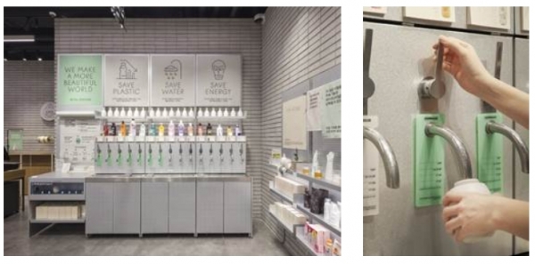 아모레스토어 광교에선 아모레퍼시픽에서 판매하는 15개 제품의 내용물을 담아갈 수 있으며 원하는 만큼만 코코넛 껍질로 만든 용기에 담은 다음 무게를 측정해 그램(g) 당 가격을 내면 된다. 상품별로 가격이 다르지만 대체로 일반 용기 제품 가격의 절반 이하 수준이다. 제조 후 100일 이내 내용물만 판매하고, 보충하기 전 용기를 살균 처리해 소비자들이 안심하고 살 수 있도록 했다.