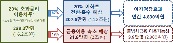 금융당국은 이번 최고금리 인하로 20% 이상 금리로 대출을 이용하던 239만명 중 87%인 208만명의 이자 부담이 연 4830억원 줄어들 것으로 추산했다. 다만 대출 만기가 도래하는 13%(31만6000명)의 경우, 3~4년에 걸쳐 민간금융 이용이 축소될 가능성이 있다고 분석했다. 이 중 3만9000명은 불법 사금융으로 빠져들 수 있다.