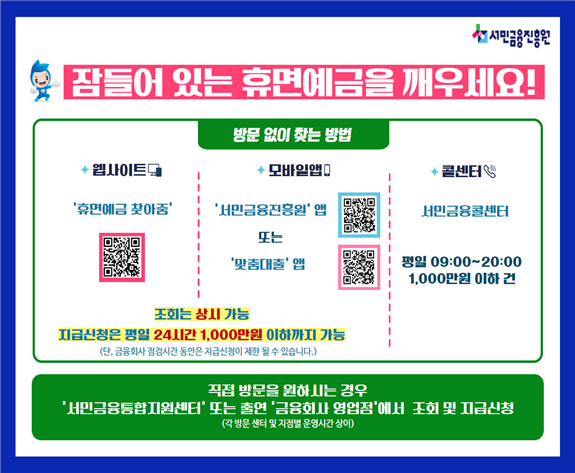 휴면예금이 1000만원 이하인 경우 창구 방문 없이 서금원의 모바일 앱(애플리케이션)이나 '휴면예금 찾아줌' 웹페이지에서 찾을 수 있다. 상속인이나 대리인 등 비대면 서비스 이용이 불가능할 땐 가까운 휴면예금 출연 금융회사의 영업점, 서민금융통합지원센터를 방문하면 된다.