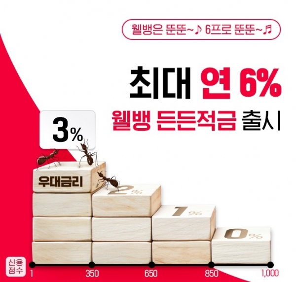 웰뱅든든적금은 내년부터 변화·적용되는 개인신용평점 제도에 맞춘 상품으로 신용평점이 낮은 고객에게 더 높은 우대금리가 제공되는 게 특징이다. 기본금리는 연 2%로 매월 최대 30만원씩 납부할 수 있다. 계약기간은 12개월 단일 계약이다. 웰컴저축은행을 처음 이용하는 고객에게 1%포인트(p)의 우대금리가 제공된다.