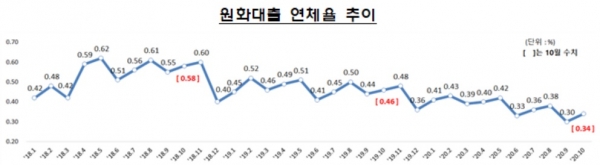 14일 금융감독원에 따르면 10월 말 기준 국내은행 원화대출 연체율(1개월이상 원리금 연체기준)은 0.34%로 전월 말(0.30%) 대비 0.04%포인트(p) 상승했다. 다만 지난해 10월 말(0.46%)과 비교해서는 0.12%p 하락했다.