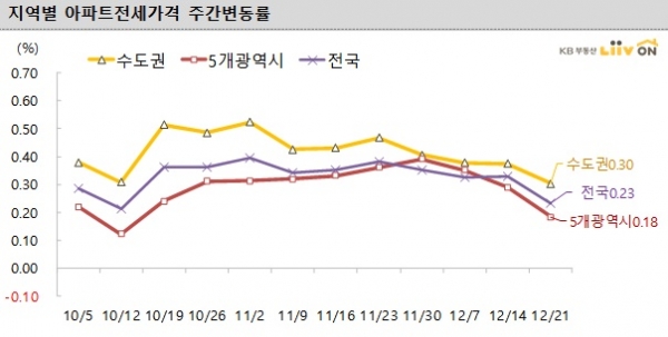 수도권(0.30%)과 5개 광역시(0.18%), 기타 지방(0.12%)도 전세가격 상승률이 지난주보다 둔화된 모습을 보였다.