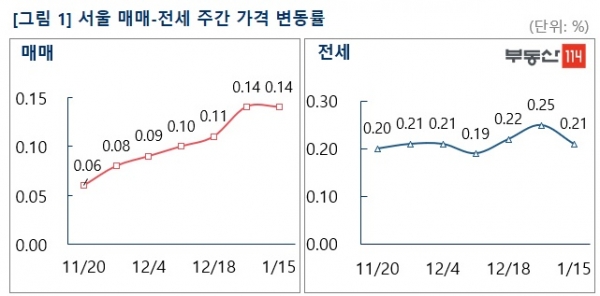 임병철 부동산114 수석연구원은 "새해 들어 2주가 지났지만 서울·수도권 주택시장 분위기는 크게 달라지지 않았다"며 "매수 수요가 간간이 이어지고 있지만 시장에 나오는 매물이 없어 호가가 꾸준히 오르는 상황이다"고 말했다.