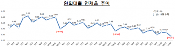 9일 금융감독원의 '국내은행 원화대출 연체율 현황'에 따르면 지난해 12월 말 기준 국내은행 원화대출 연체율(1개월 이상 원리금 연체)은 0.28%로 전월말(0.35%) 대비 0.07%포인트(p) 하락했다. 이 수치는 2007년 1월부터 집계를 시작한 국내은행 원화 대출 연체율 중 최저치다.