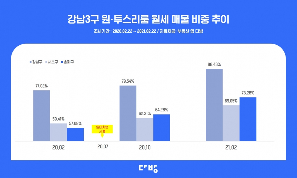 박성민 다방 사업마케팅본부 이사는 "강남3구를 중심으로 서울 주택의 전세의 월세화 현상이 가속화되고 있다"며 "임대차법 시행 이후 계약 기간이 사실상 4년으로 늘고, 보증금 인상폭은 제한되면서 주택 소유자들 사이에서 전세 매물을 월세로 전환하는 추세는 당분간 이어질 전망"이라고 말했다.