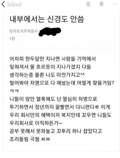 직장인 익명 커뮤니티 '블라인드'에는 지난 9일 LH 신도시 투기 의혹과 관련해 LH 직원으로 추정되는 사람의 글이 게재됐다. 해당 글에는 "내부에서는 신경도 쓰지 않고 있고, 한 두 달만 지나면 사람들의 기억에서 잊혀질 것", "아무리 '열폭(열등감 폭발)'해도 난 열심히 차명으로 투기하면서 정년까지 편히 쉬련다" 등의 내용이 담기면서 논란을 일으킨 바 있다.