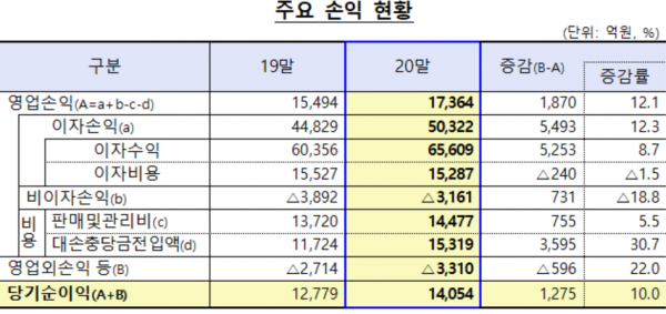 대출확대로 이자이익이 5조322억원을 기록하며 전년보다 12.3%(5493억원) 증가한 것이 주효했다. 지난해 저축은행 총 대출액은 77조6000억원으로 2019년(65조원)과 비교해 19.4%(12조6000억원) 늘었다. 가계대출이 5조5000억원, 기업대출이 6조원 각각 증가했다.