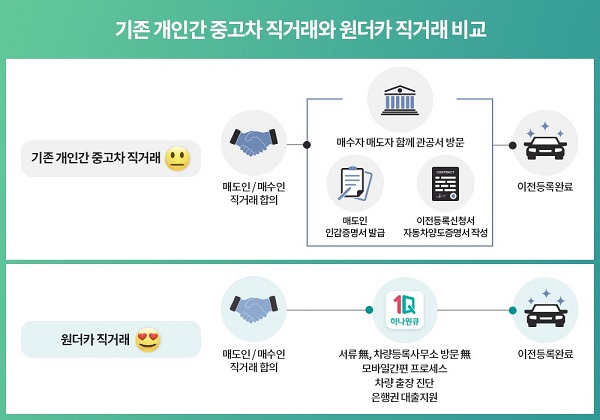 원더카 직거래는 동호회 등 중고차 직거래 장터에서 이뤄지는 개인 간 중고차 직거래에 대해 신뢰성과 편의성을 더해주는 플랫폼 서비스다. 은행권 최초로 개인 간 중고차 직거래에 대해 오토금융을 제공한다.