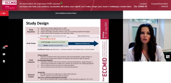 이날 학회에선 렉키로나의 글로벌 임상 3상 연구자로 참여한 오아나 산두레스쿠 루마니아 캐롤 다빌라 의학·약학 대학 박사가 경증 및 중등증 코로나19 환자 총 1315명을 대상으로 한 28일간의 임상 결과를 발표했다. 임상 연구진은 입원 및 산소치료가 필요한 상태로 악화하거나 사망한 환자의 비율을 나타내는 중증환자 악화율과 임상적 증상 개선 시간을 평가지표로 지정해 분석했다.