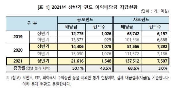 28일 한국예탁결제원에 따르면 올해 상반기 공모펀드의 이익배당금은 2조1616억원으로 전년동기(1조4406억원) 대비 50.1% 늘었고, 사모펀드는 13조7512억원으로 68.6% 증가했다. 배당금지급 펀드수 기준 공모펀드는 1548개, 사모펀드는 7507개로 전년 동기 대비 각각 43.5%, 3.0% 늘었다.