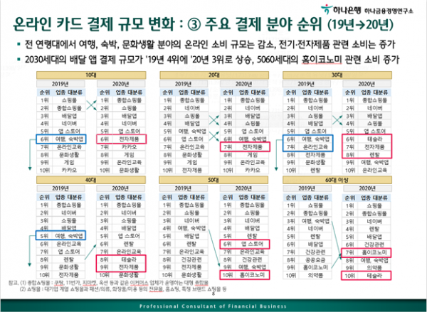 하나금융경영연구소는 4일 이같은 내용을 담은 '세대별 온라인 소비 행태 변화와 시사점' 보고서를 발표했다. 보고서는 2019년 1월부터 2020년 12월까지 총 2년간 하나카드 온라인 결제 데이터를 바탕으로 분석한 것이다.