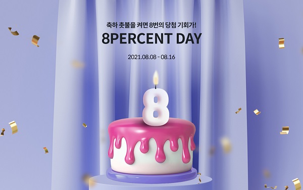 [서울파이낸스 이진희 기자] 국내 1호 온라인투자연계금융업자(온투업자)인 8퍼센트는 온라인투자연계금융 상품 투자자 대상으로 8퍼센트데이(8PERCENT DAY) 이벤트를 진행한다고 6일 밝혔다.