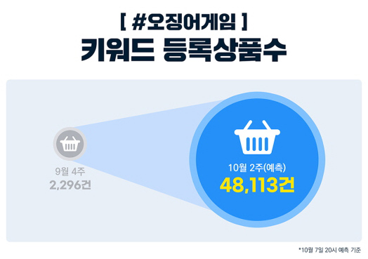 조사 결과 오징어게임을 키워드에 활용해 등록된 상품수는 9월 4주(9월 19일~ 9월 25일) 2296건에서 3주만인 10월 2주(10월 4일~ 10월 9일)에 1996% 증가한 4만8113건에 달할 것(10월 7일 20시 기준, 예측치)으로 나타났다. 오징어게임에 대한 입소문이 퍼져나가기 시작한 10월 1주(9월 26일~10월 2일)에 해당 키워드를 활용한 상품은 전주 대비 842% 늘어난 2만1620건이었다.