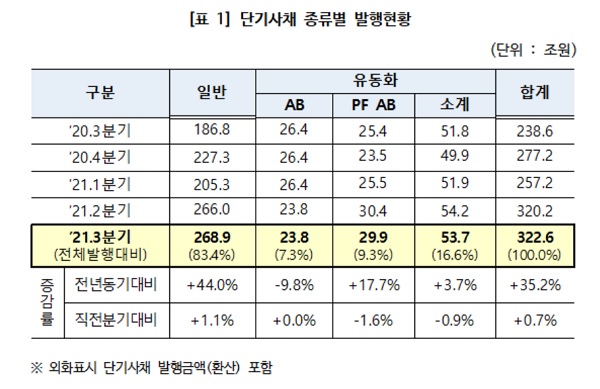 같은기간 일반 단기사채 발행량은 268조9000억원으로 작년 동기(186조8000억원) 대비 44.0% 증가했다. 유동화 단기사채 발행량은 53조7000억원으로 작년 동기 대비 3.7% 늘었다. 유동화 단기사채는 일반기업, 증권회사 및기타 금융회사 등이 발행하는 일반 단기사채 외 특수목적회사(SPC)가 발행하는 AB(Asset Backed)STB, PFAB(Project Financing Asset Backed)STB 를 의미한다. 외화표시 단기사채의 발행량은 5억450만달러로 전년동기(3억6790만 달러) 대비 37.1% 증가했다.