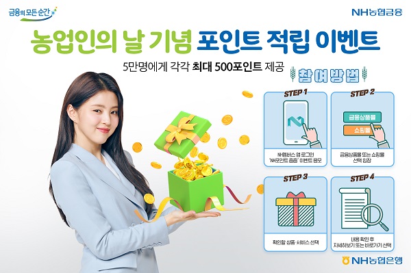 [서울파이낸스 이진희 기자] NH농협은행은 농업인의 날을 맞아 오는 30일까지 NH멤버스 회원을 대상으로 포인트를 적립할 수 있는 '농업인의 날 기념! NH포인트 줍줍 이벤트!'를 진행한다고 11일 밝혔다.