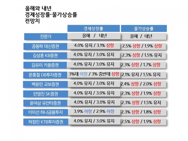 전문가 9명 중 7명은 올해 성장률 4.0% 유지가 가능할 것으로 내다봤다. 나머지 2인은 3%대로 하향 조정될 것으로 전망했다. 내년 성장률은 기존 전망치인 3.0%가 유지될 것으로 내다봤지만 2%대부터 3% 중반까지 다양한 의견이 제시됐다.