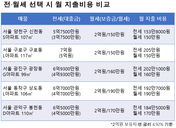 타 지역에서도 비슷한 경우를 찾아볼 수 있다. 같은 조건으로 서울 양천구 5억7500만원(107㎡), 관악구 5억5000만원(110㎡) 전셋집을 대출을 이용해 얻을 경우 월 지불해야 하는 금액은 각각 153만8000원, 184만5000원이다.