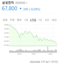 8일 삼성전자는 전 거래일 대비 200원(0.29%) 하락한 6만7800원에 마감했다. 삼성전자는 이달 들어서 2.58% 떨어졌다. 이날 오전 상승세를 보였던 삼성전자는 하락세로 돌아서면서 장중 한때 6만7700원까지 하락했다.