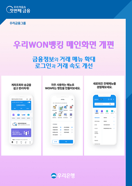 [서울파이낸스 이진희 기자] 우리은행은 고객 편의성을 높이기 위해 '우리WON뱅킹'의 메인화면과 전체메뉴를 개편하고, 로그인과 처리 속도를 개선했다고 12일 밝혔다.