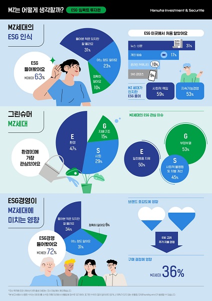 2022 MZ세대 투자인식 보고서는 'ESG·임팩트 투자'와 '파이낸셜 케어'로 나눠 발간했으며, 한화투자증권 공식 블로그 '라이프 포트폴리오'에서 확인 할 수 있다. 한화투자증권은 새로운 소비와 투자의 중심으로 성장하고 있는 MZ세대들이 가진 생각을 이해하고 바른투자로 안내하기 위해 이번 보고서를 준비했다. 이번 보고서는 한화투자증권이 '대학내일20대연구소'와 함께 전국 17개 시도에 거주하는 MZ세대(1981~2003년생) 500명을 대상으로 한 설문조사 결과를 바탕으로 분석했다.