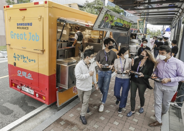 삼성바이오로직스가 푸드트럭 행사로 임직원 사기진작에 나섰다. 27일부터 30일까지 열리는 이 행사는 임직원을 응원하기 위해 마련됐다. 이 기간에만 총 5000인분의 간식이 나눠졌다. 삼성바이오로직스는 점심시간뿐만 아니라, 24시간 교대로 근무하는 직원들을 위해 야간 시간대에도 푸드트럭을 운영했다.