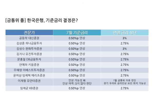 전문가들은 연내 기준금리 상단을 2.75~3.00% 수준으로 제시했다. 전문가 10명 중 7명은 연내 금리 상단을 2.25%로 내다 봤고 7월 금통위 이후 추가 금리인상 시점은 8월로 예상했다.