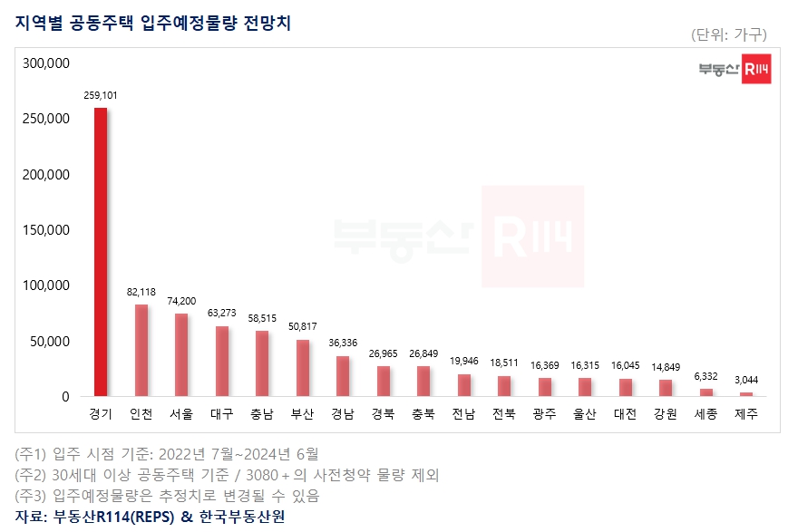 23일 부동산R114와 한국부동산원이 공동으로 조사한 '공동주택 입주예정물량 정보'에 따르면 올해 7월부터 2024년 6월까지 입주예정물량은 전국 78만9585가구로 집계됐다. 이중 수도권 41만5419가구, 지방 37만4166가구로 전체 물량에 50% 이상이 수도권에 집중됐다.