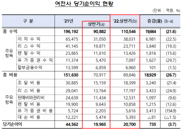 20일 금융감독원이 발표한 '2022년 상반기 여신전문금융회사 영업실적'에 따르면 상반기 중 여전사의 순이익은 2조700억원으로 나타났다. 이는 전년 동기(1조9965억원) 대비 3.7%(735억원) 증가한 수치다.