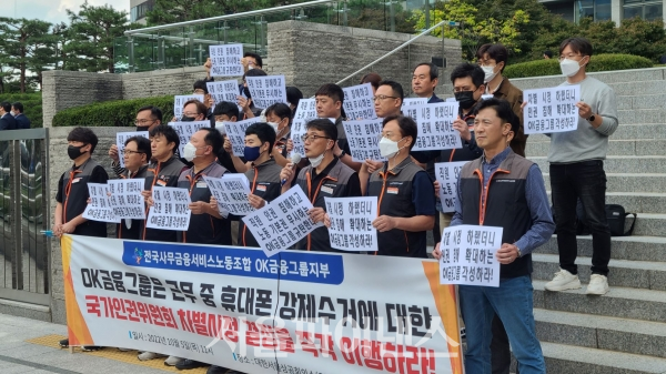 전국사무금융서비스노동조합 OK금융그룹지부는 5일 오전 OK금융그룹 사무실이 있는 대한상공회의소 앞에서 비인권적 차별행위에 대한 국가인권위원회 차별시정 결정을 즉각 이행할 것을 촉구하는 기자회견을 개최했다.