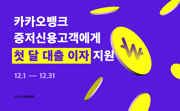 [서울파이낸스 이진희 기자] 카카오뱅크는 12월 한 달간 중·저신용고객 대상으로 '첫 달 이자 지원' 이벤트를 진행한다고 30일 밝혔다.