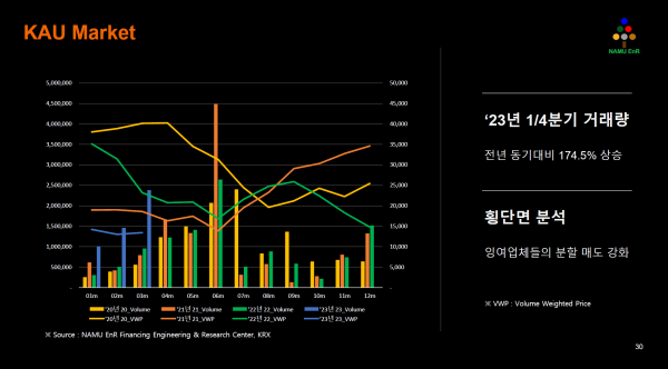 2023년 1분기 동안 국내 탄소배출권시장은 구조적으로 많은 변화가 있다. 통상적으로 예년과 같으면 1분기 동안은 거래량 부진과 약보합의 가격 움직임을 보여 왔다. 그러나 올 1분기에는 그동안의 선례를 깨고 전혀 다른 시장 움직임이 관측되었다.