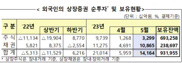 8일 금융감독원이 발표한 '2023년 5월 외국인 증권투자 동향'에 따르면 지난달 외국인은 총 14조1640억원을 순투자했다.