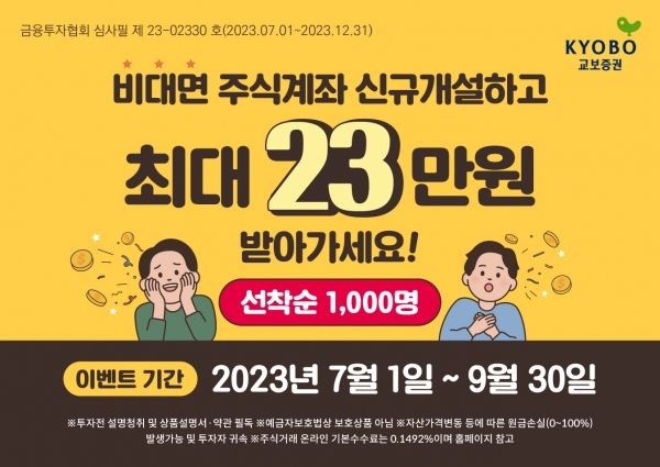첫 비대면계좌 개설 고객에게 추가 혜택 이벤트도 진행한다. 계좌에 일정금액 이상 순입고시 금액에 따라 최소 1만원부터 최대 20만원 현금을 지급한다. 또한 100만원 이상 매매시 교보증권 금융투자상품권 1만원을, 1000만원 이상 매매시 추가로 1만원을 지급한다.