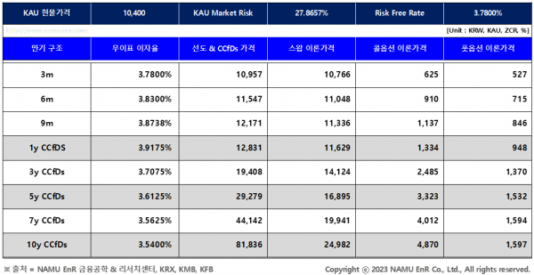 ※ 서울파이낸스와 NAMU EnR 금융공학 & 리서치센터에서는 매주 월요일 탄소배출권 장외파생상품(선도 및 CCfDs, 스왑, 옵션) 이론가격을 산정, 발표하고 있습니다. 본 자료는 NAMU EnR 저작물로 모든 저작권은 당사에게 있으며 신뢰할 만한 데이터 및 통계 기법을 이용하여 산정된 자료로 그 정확성이나 완전성을 보장할 수 없습니다. 따라서 고객의 투자결과에 대한 법적 책임소재 및 그에 대한 증빙자료로 사용 될 수 없으며 무단 전재, 복사, 재배포를 금지합니다.