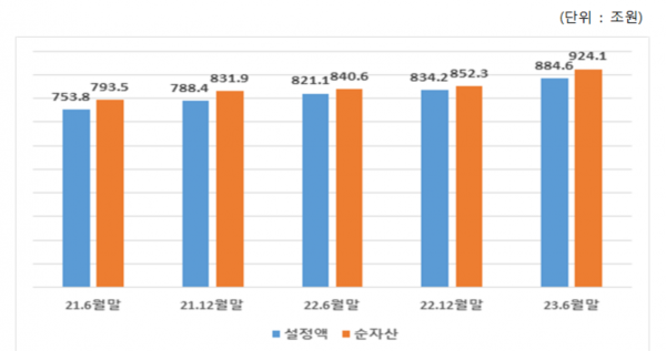 12일 금융투자협회는 '2023년 상반기 펀드시장 동향' 발표를 통해 올해 상반기 말 기준 전체 펀드 순자산이 924조1000억원으로 전년말 대비 71조8000억원(8.4%) 증가한 것으로 집계됐다고 밝혔다.