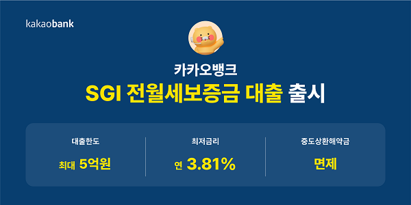 SGI전월세보증금 대출은 전월세보증금의 최대 80% 한도 이내에서 최대 5억원까지 대출이 가능한 상품이다. 이에 따라 카카오뱅크에서 받을 수 있는 전월세보증금 대출 최대 한도는 2억2200만원에서 5억원까지 확대된다. 대출금리는 최저 연 3.81%대다.