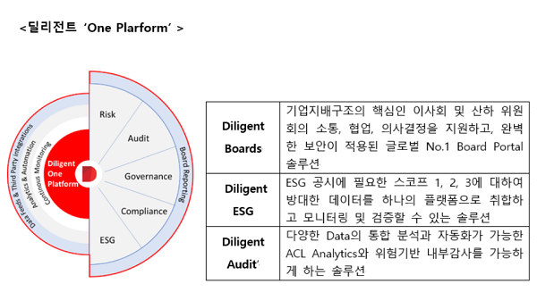GRC는 기업 경영 목표 달성(Governance), 불확실한 리스크 관리(Risk), 철저한 규정준수(Compliance)를 통해 조직을 효율적으로 운영하는 전략을 말한다. GRC 솔루션은 3가지 영역에 걸친 기업 활동을 효과적으로 수행하기 위한 IT기반 시스템이다. 딜리전트 GRC 솔루션은 '원 플랫폼(One Platform)’ 아래 전문적인 솔루션을 제공하고 있으며, 많은 글로벌 리딩 기업들이 효율적인 조직 관리를 위해 딜리전트 GRC 솔루션을 활용하고 있다.