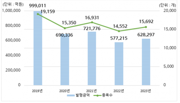 22일 한국예탁결제원에 따르면 지난해 주가연계파생결합사채(ELB)를 포함한 ELS 발행금액은 전년(57조7000억원) 대비 8.9% 증가한 62조8297억원으로 집계됐다.