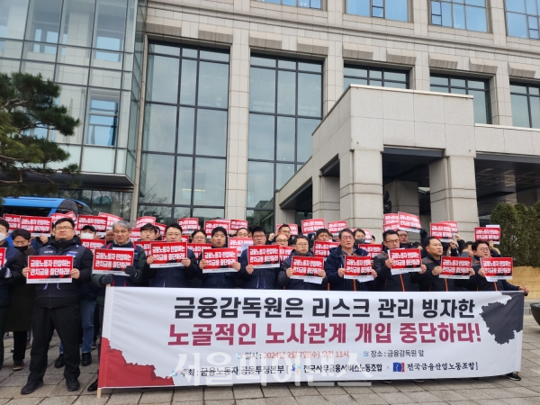 7일 금융노동자 공동투쟁본부(전국사무금융서비스노동조합, 전국금융산업노동조합)는 서울 여의도에 위치한 금융감독원 앞에서 '금감원의 리스크관리를 빙자한 노사관계 개입 규탄 기자회견'을 열고 "리스크 관리를 빙자해 금융위기 모든 책임을 금융 노동자들에게 전가하는 것은 부당노동행위"라고 강조했다.
