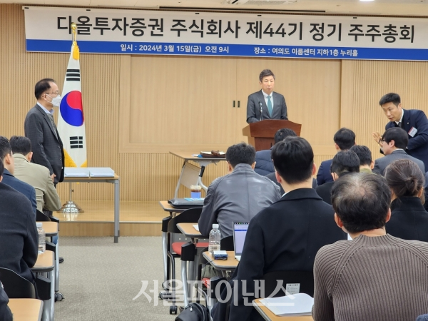 15일 다올투자증권은 서울 여의도 이룸센터에서 제 44기 정기주주총회를 개최했다. 앞서 김 대표는 이번 주주총회에서 △권고적 주주제안 신설의 건 △주주총회 보수심의 신설의 건 △이사의 수 및 임기 변경의 건 △차등적 현금 배당의 건 △임원퇴직금 지급규정 일부 변경의 건 △유상증자에 따른 자본금 확충의 건 등 총 12건에 달하는 주주제안을 냈다.
