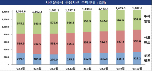 해당기간 자산운용사의 운용자산은 1482조6000억원으로 전년 말(1397조9000억원) 대비 84조7000억원(6.1%) 증가했다. 펀드수탁고는 924조8000억원으로 이 중 공모펀드가 329조2000억원(35.6%), 사모펀드가 595조6000억원(64.4%)를 차지했다.
