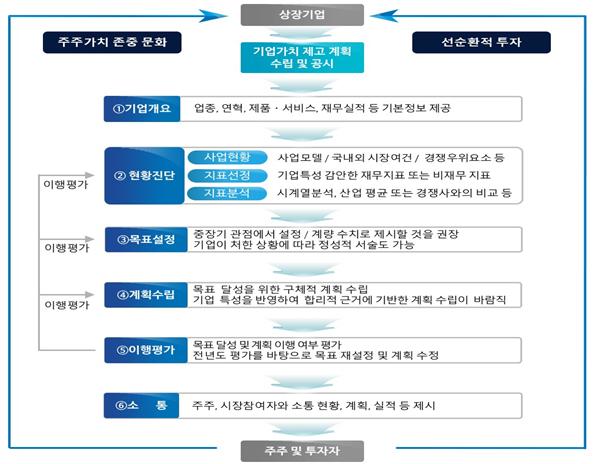 발표된 가이드라인에 따르면 상장기업들은 기업가치 제고 계획을 '기업개요–현황진단–목표설정–계획수립–이행평가–소통'의 목차로 작성해야 한다. 해당 가이드라인 시행 이후 준비가 되는 상장기업 부터 공시가 시작되며, 현재 준비 중인 기업도 투자자와 적극적으로 소통할 수 있도록 향후 공시 일정을 사전에 안내하는 예고 형태의 공시도 가능하다.