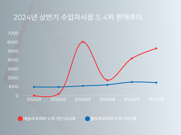 실제 테슬라코리아는 모델Y·3를 앞세워 호실적을 거뒀다. 두 차의 올 1~6월까지 합산 판매 대수는 1만7067대, 전체 판매 비중 98.2%. 테슬라코리아가 같은 기간 판매 대수 1만7380대, 점유율 13.83%, 이에 따른 전체 순위 3위를 기록하는 데 크게 이바지했다는 것을 알 수 있다. 4위 볼보차코리아와의 판매·점유율 격차도 각각 1만195대, 8.11%포인트로 벌렸다.